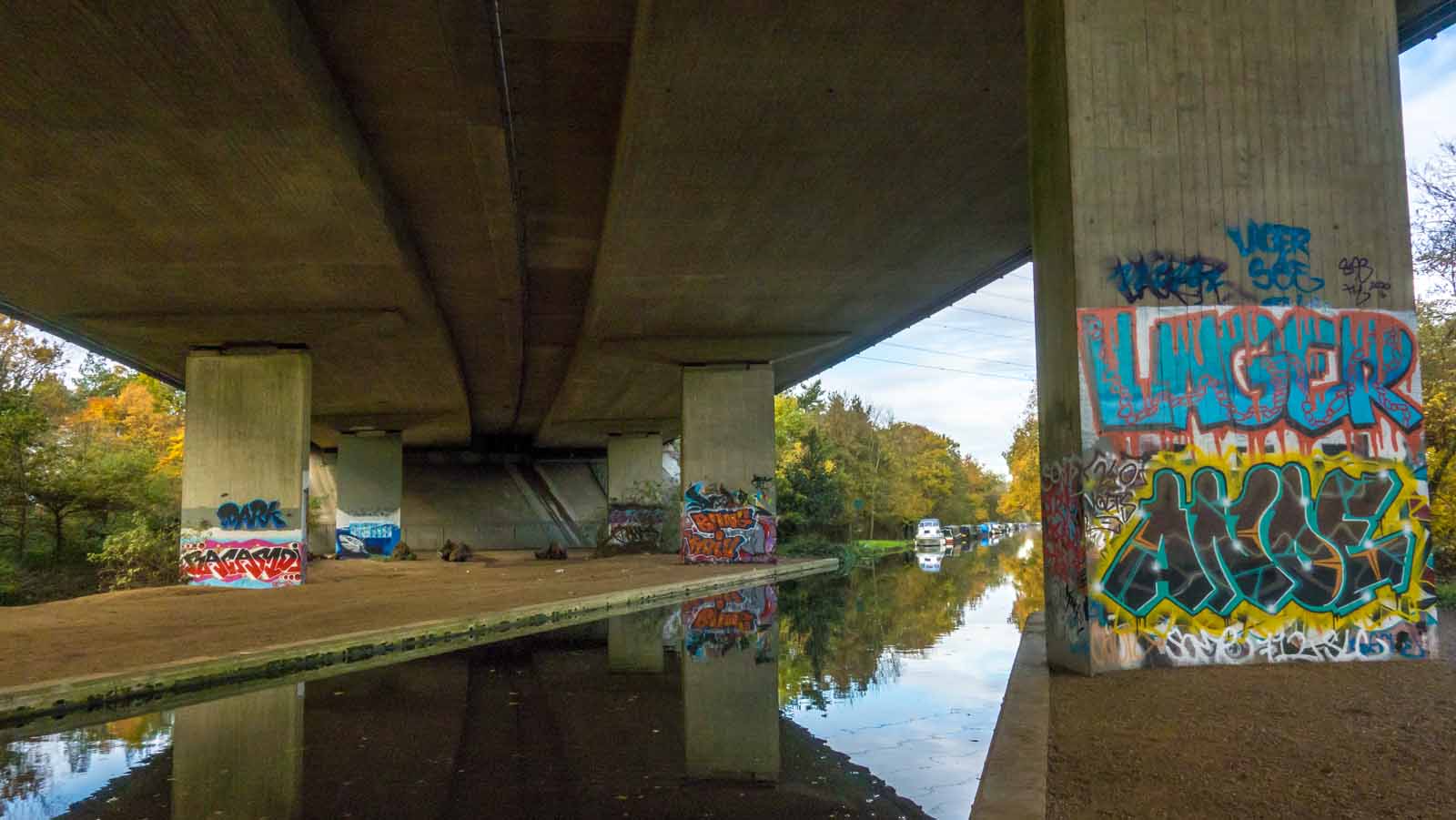 It should have been a lovely Autumn walk along the River Wey, but today the sun was in short supply and I was a little disappointed. My walk started at Byfleet, passed over the M25 to the river, and then parallel to the motorway for a while, so initially it’s very noisy for a country walk. I doubled back after an hour and a half, continuing a bit further along the river and under a monster of a bridge carrying the motorway over the river.