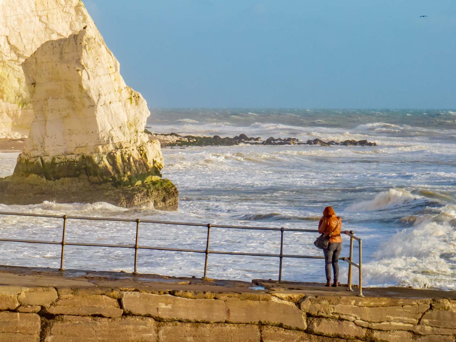 Ten miles down the coast from Eastbourne is Seaford. I’ve never been a fan of Seaford but we were looking for somewhere to drive that was not too distant. There was a gale strong enough to blow us away so we headed briskly towards the inviting cliffs. There are some rather colourful beach huts on the promenade and a lot of activity as large trucks redistributed shingle from the end of the beach to further up. I didn’t envy the digger working so close to the water’s edge as the gale did its best to wash it away!