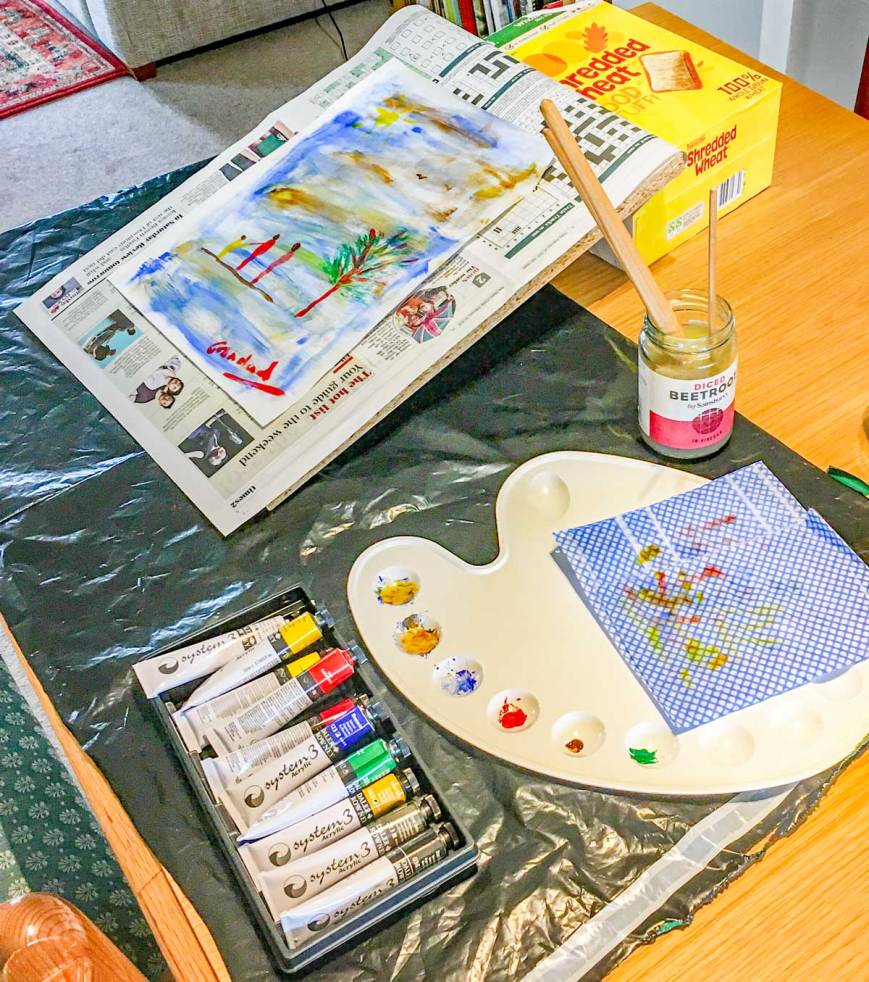 What have I talked myself into? I casually suggested to my daughter that on a Zoom call I could do some painting with the little ones. So I invested in some gear, and here is my studio setup. My daughter suggested acrylic paints but I did find it all a bit fiddly squeezing bits out of tubes – oh for a paintbox! I think I’ve verified my opinion that I have no artistic skills as well as no shame, but early days, eh! If nothing comes of it I can pass on my materials to Chloe and Iris.