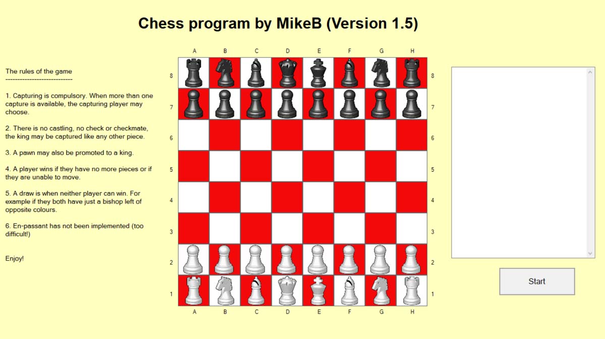My second VB.NET program was to play the game of Loser Chess. The object is to lose one’s pieces before your opponent does! I never considered attempting to develop a program to play proper chess as it would have been impossible to get the computer to make sensible moves. So instead, I decided to concentrate on the mechanism of playing chess and to use it to play a simplified version. ie Loser Chess.
