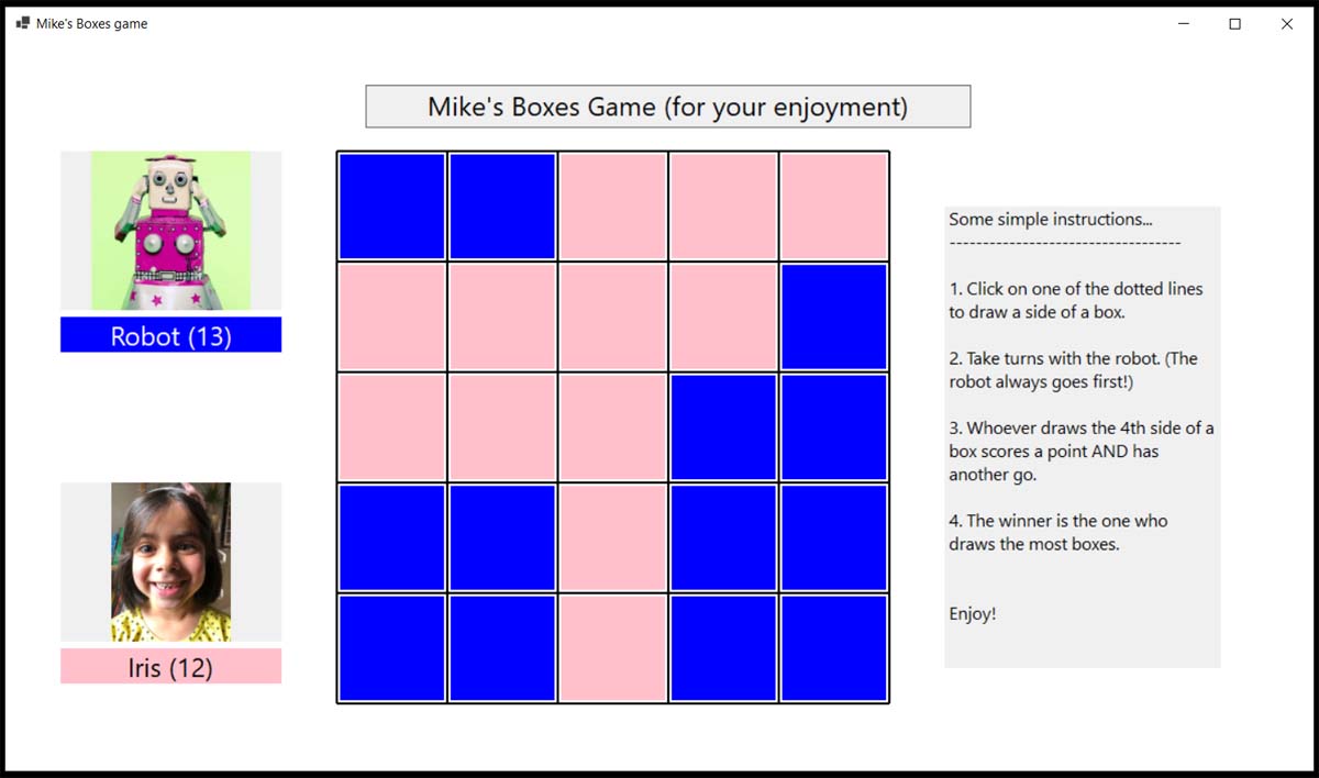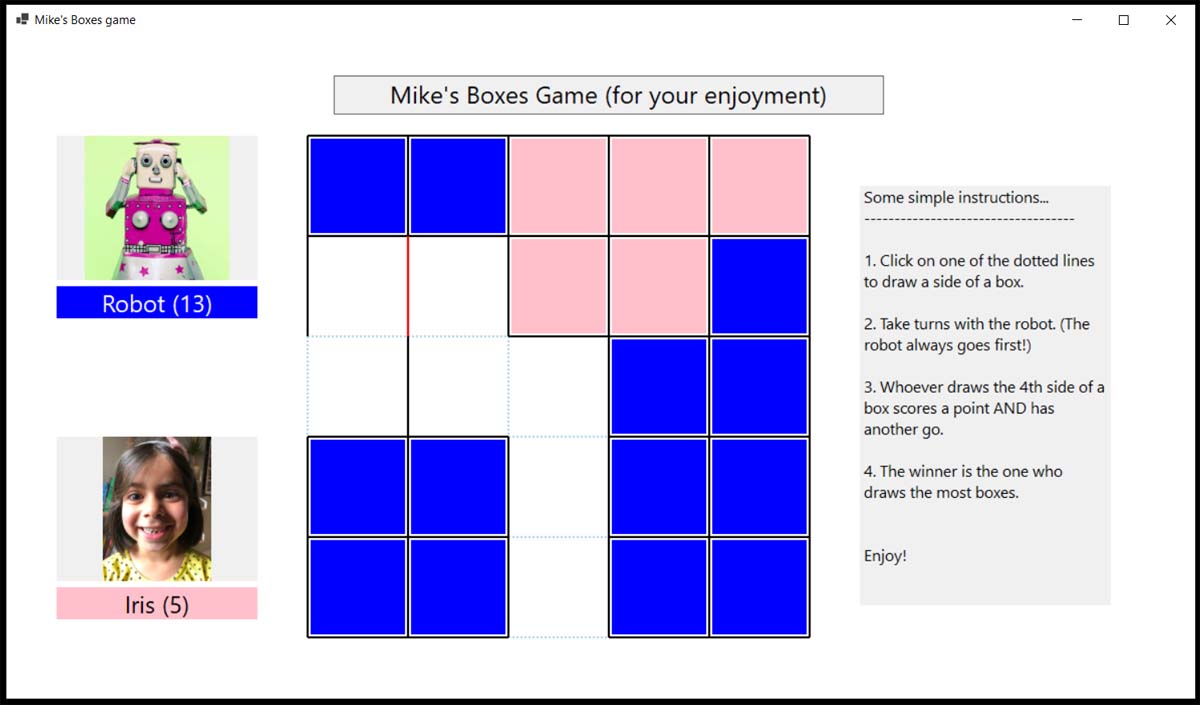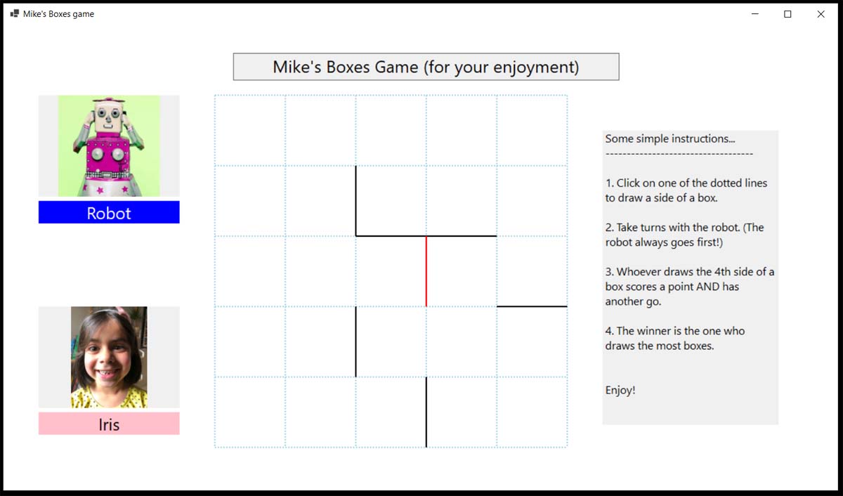 I’ve completed my third VB.NET program, to play the game of what I call Boxes but which I think is called Dots and Boxes.