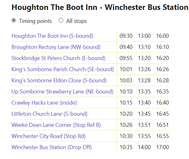Salisbury to Houghton (14 miles) have to arrive by 4pm for the only bus to Winchester!